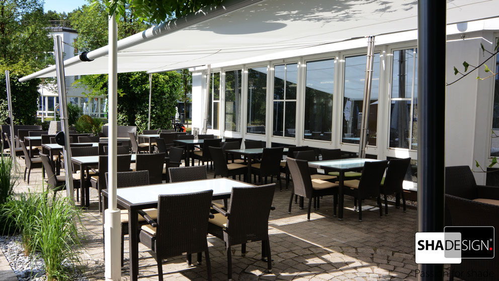 Das SHADE verbindet die elegante und leichte Ausführung eines Sonnensegels mit den Vorteilen eines aufwendigen Markisensystems.
