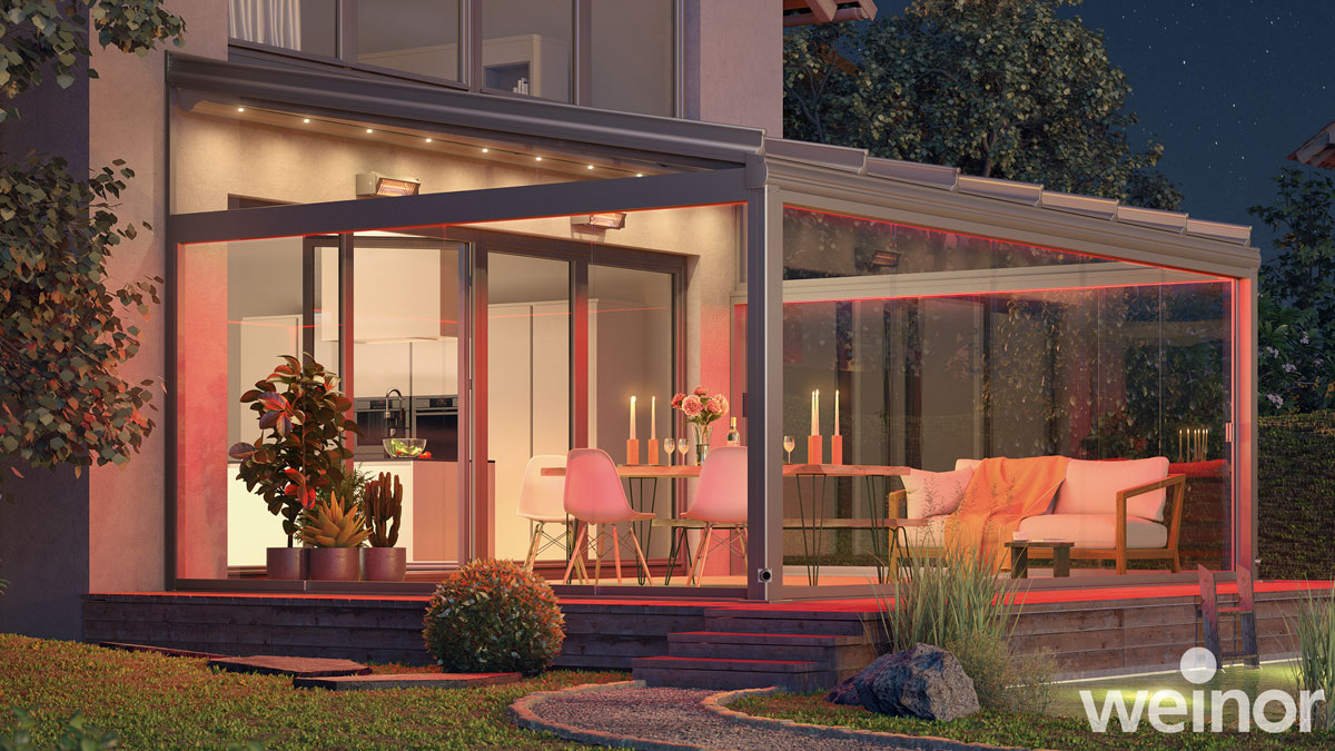Mit einer weinor Glasoase® kann die Terrassensaison bereits im Frühjahr beginnen und sich bis in den Herbst hineinziehen. Zusätzliches Zubehör wie LED-Beleuchtungen oder Elektro-Heizstrahler sorgen für Wärme und Ambiente, wenn die Tage noch oder schon wieder kürzer sind. Und wenn es draußen richtig sommerlich wird, lässt sich die gläserne Front komplett beiseiteschieben.